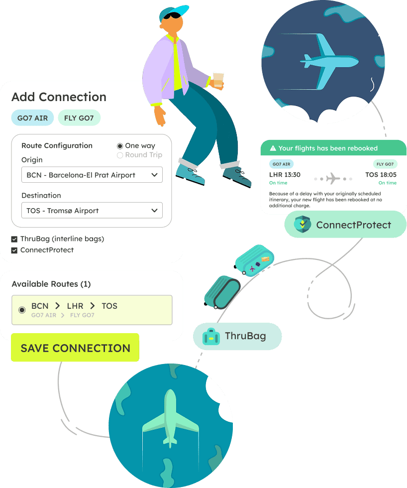 Get in touchGO7 provides airlines with everything they need to sell more, spend less, and operate smarter. Our platform brings together bookings, payments, and retailing in one system, helping you expand distribution through OTAs, GDS, and virtual interlining. Join the 200+ airlines already using GO7.