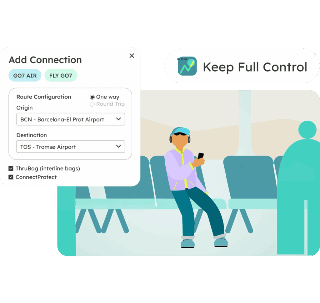 With GO7, you don’t join someone else’s network; you create your own. Build and sell multi-airline journeys directly from your website, with one ticket, through-checked bags, and disruption protection included. All without formal interline agreements.